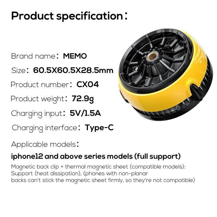مشخصات: برند: ممو MEMO/ مدل: CX04/ شارژ ورودی: 5V/1.5A / مناسب برای تمام گوشی های همراه مخصوصا آیفون 12 به بالا/ نوع اتصال: باسیم/ بدون صدا و لرزش /کابل اتصال: Type-C /توانایی خنک کنندگی 360 درجه /پرقدرت با قدرت خنک کنندگی بالا /طول کابل: 1.5 متر