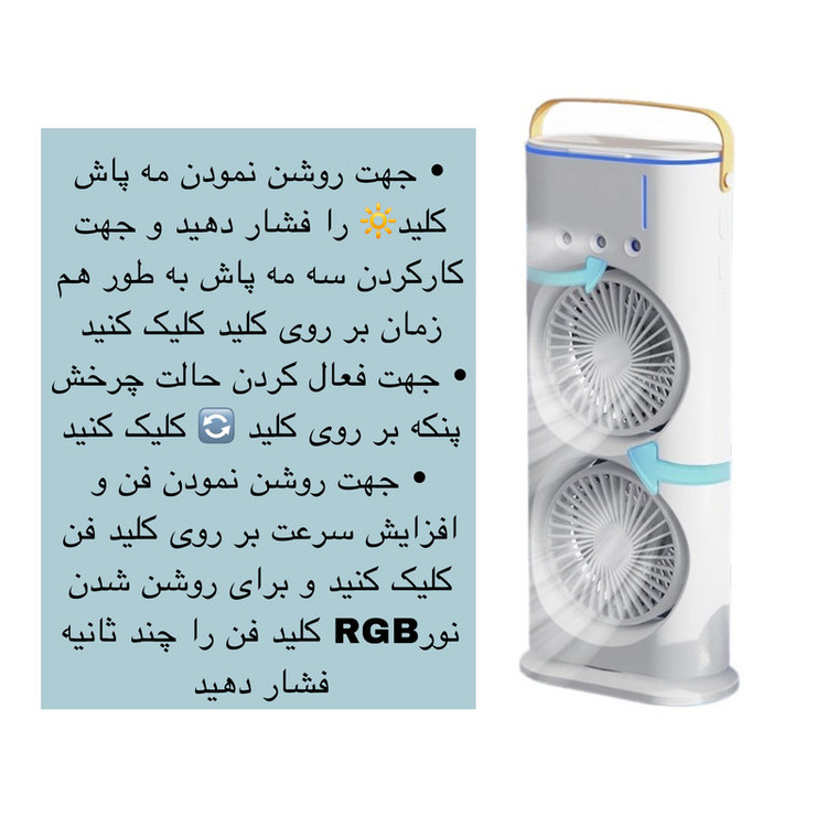 سایر مشخصاتنور پردازی RGB- دارای مه پاش- قابلیت چرخش- زاویه شیب قابل تنظیم- دارای دو عدد فن- دارای 3 سطح سرعت-